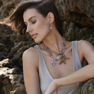 Two-tone camel brown suede and burnished silver belcher chain necklace with a semi-precious nugget, tassel and lion charm.